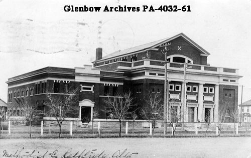Circa 1915 photograph from the southwest showing the original 1913 building with its prominent columns and pediment and the 1914 hall addition at left. Source: PA-4032-61, University of Calgary Glenbow Archives Collection.