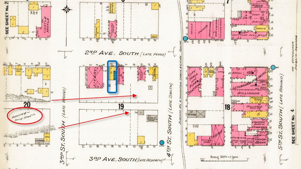 A fire insurance map of 1910 predates the construction of the Chinese Free Masons Building on Block 19 Lot 5 (blue outline) but notes infilling of the ravine or coulee (circle at lower left). Arrows indicate the original extent of the coulee eastward through Block 19. Source: Library and Archives Canada, with added annotations.