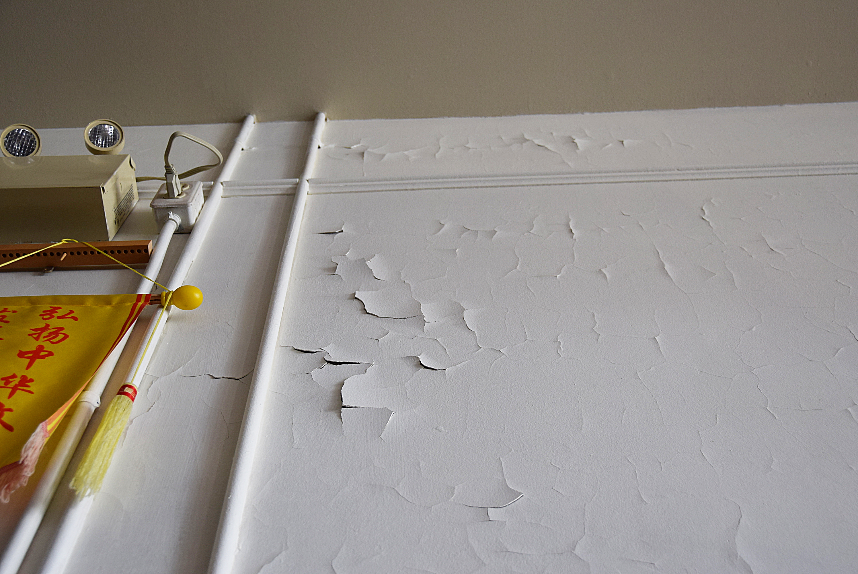 The west wall is thus a highly porous brick that readily absorbs moisture. Like many old brick buildings, the Chinese Free Masons Building uses a high-quality, durable brick on the front facade with less expensive bricks on the side walls that were often intended to be protected by adjacent buildings. Mortar joints also play a role: lime mortar both binds the masonry and actively wicks moisture in the wall to the surface, where it then evaporates. However, as mortar weathers, leaching of the lime binder reduces this wicking action and eroded joints provide more surface area for water absorption, effectively turning a wall into a sponge. On the wall’s inner face, permeability declines with each layer of paint and as old alkyd paint ages. The most recent repainting was the last straw: acrylic latex paint is vapour-permeable but drying of the wall fabric relies on liquid (if microscopic) capillary moisture transfer. The result is that moisture absorbed through the exterior brick trapped within the wall literally pushes the paint off the plaster.