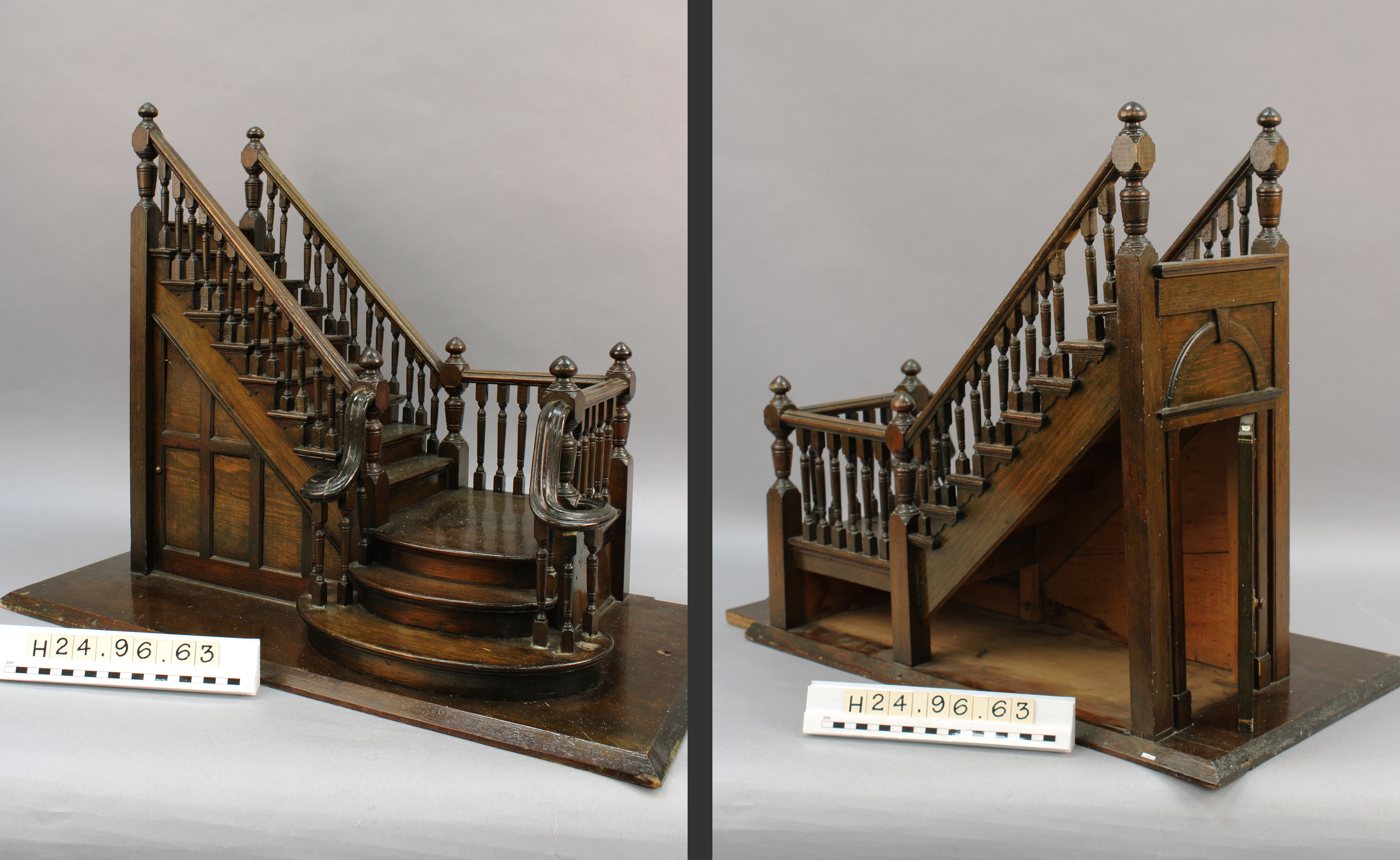 This remarkable scale model is constructed primarily of wood and mounted on a plywood base. It was most likely built to a scale of 1″: 1′ (i.e., one inch equals one foot). Though small compared to its full-scale counterpart, it’s meticulously crafted—complete with turned balusters, a square landing and even a functioning door with tiny hinges and a wooden knob. The design reflects the restrained character of early twentieth-century domestic interiors, where craftsmanship and proportion met simple, elegant ornamentation. From the graceful curve of the lower steps and railing to the careful shaping of each newel post, every element has been thoughtfully made, likely by hand woodworking tools, and with the aid of early woodworking machines.
